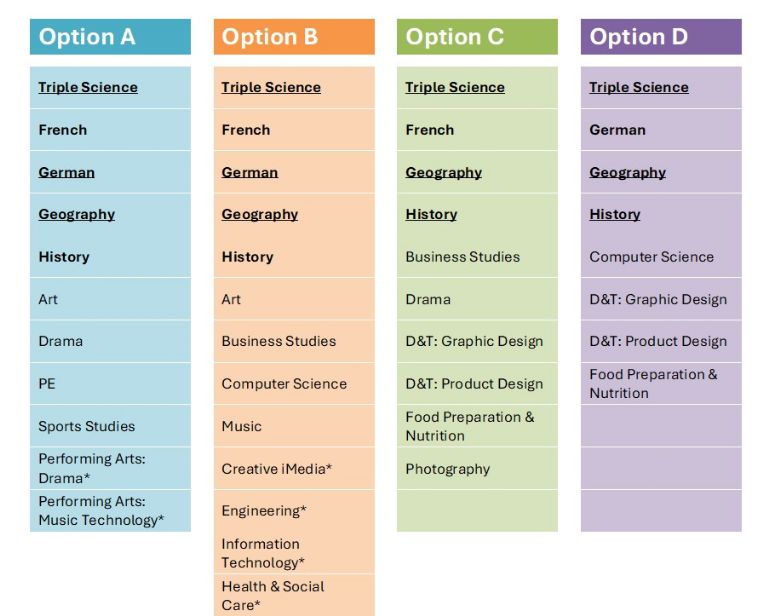 Remember, you should choose two of the following subjects as part of your choices: Triple Science, French, German, Geography or History.